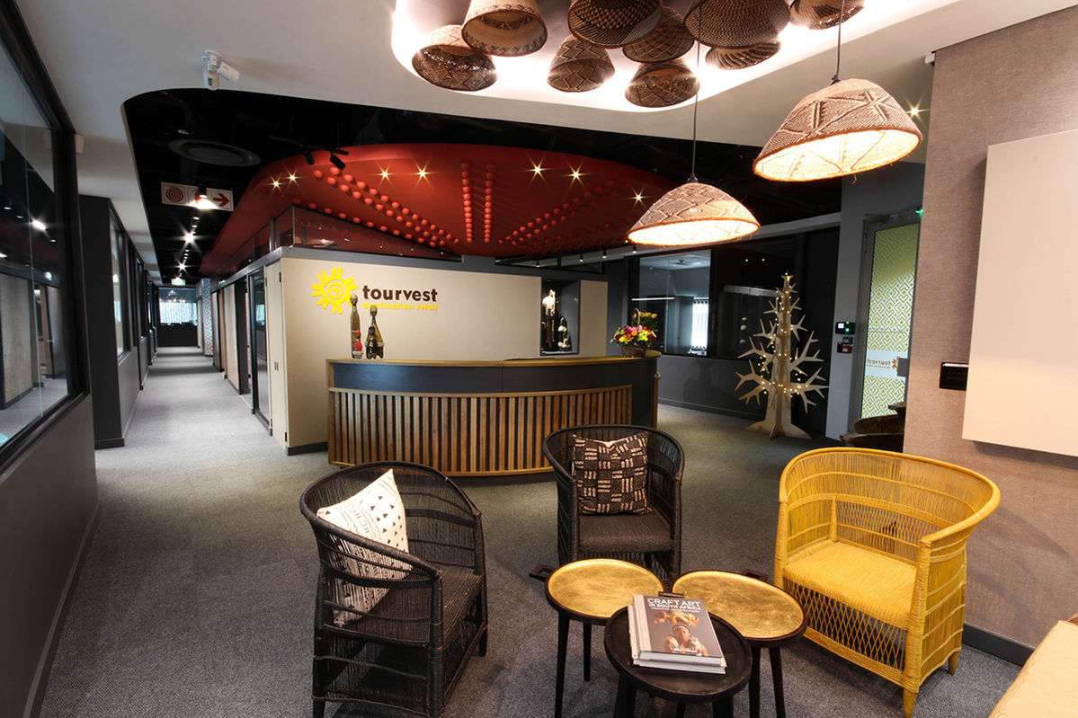Tourvest is Southern Africa’s leading integrated tourism group, operating businesses which range from travel management companies, hotels, lodges and restaurants to craft, curio and jewellery shops and foreign exchange bureaux, under some 60 sector-leading brands, employing more than 5 000 people. Heartspace were appointed to do the Interior Design for Tourvest, as part of a JV team with TEAM Architects. Their head office needed to reflect their comany ethos. We were inspired by African craft and culture, such as the Zulu Hat over the main reception. The furnishings were all from local manufacturers, mostly being from Tourvest’s supplier base.